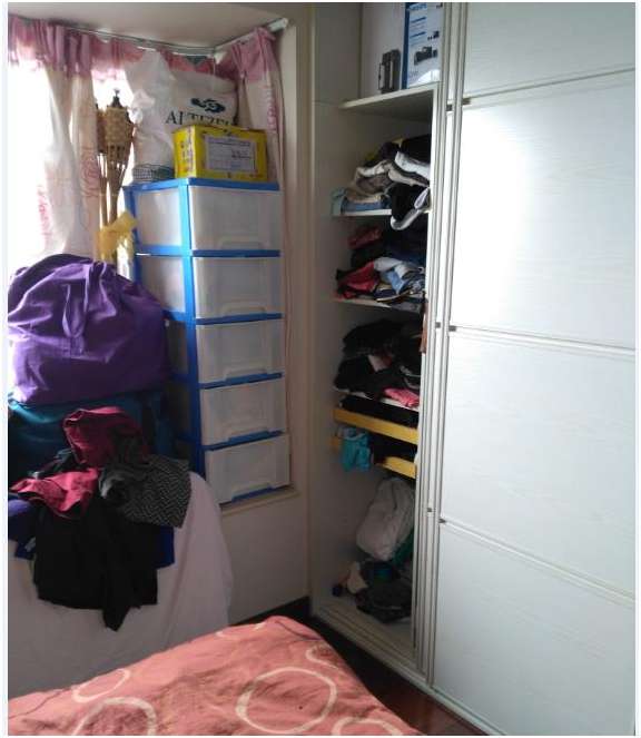 可以看外滩的飘窗上堆了各种衣服杂物。衣柜里也是凌乱不堪。小朋友的眼神很忧郁。