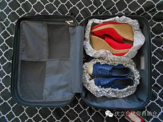 将鞋放置在浴帽中可保持其他衣物洁净。另外,把袜子和其他枝装物品放入鞋子内可以更善用空间呢!不过前提是确保鞋子没有异味。